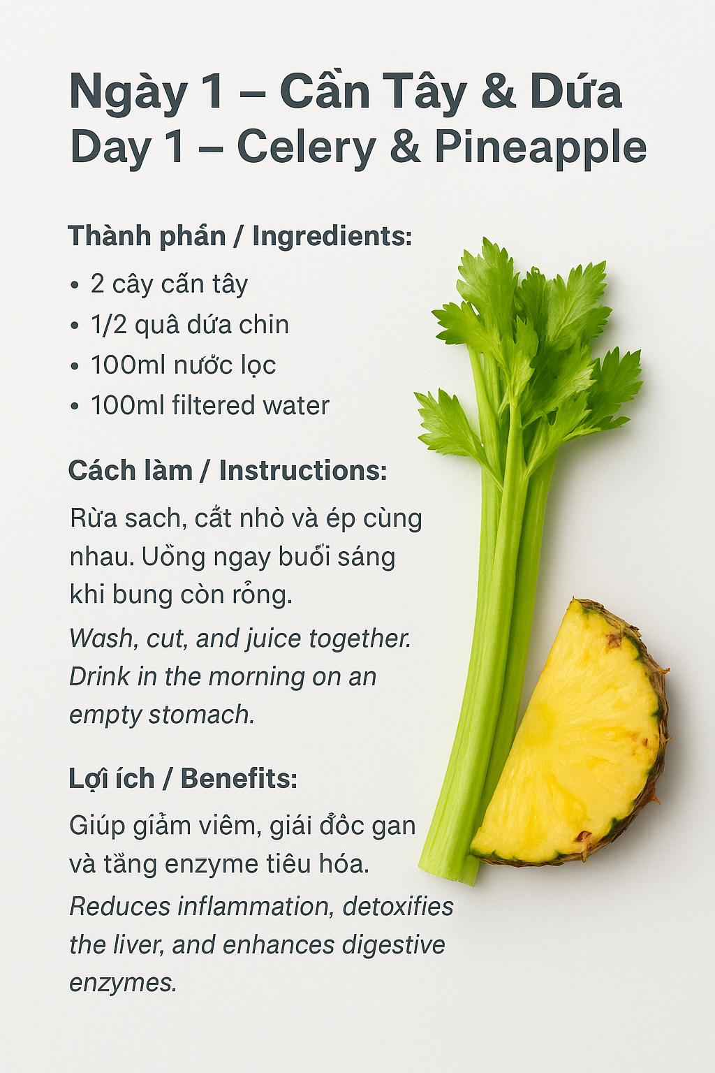 🍃 Lộ trình này được thiết kế dựa trên nguyên lý dưỡng sinh hiện đại, giúp hỗ trợ cơ thể loại bỏ vi khuẩn HP, thanh lọc gan và thận tự nhiên, tăng cường miễn dịch và cải thiện hệ tiêu hóa. 🍃 This 7-day juice detox plan is designed based on modern macrobiotic principles to help eliminate H. pylori bacteria, cleanse the liver and kidneys naturally, boost immunity, and improve digestion. ngày 1 – Cần Tây & Dứa / Day 1 – Celery & Pineapple **Thành phần / ingredients:**…